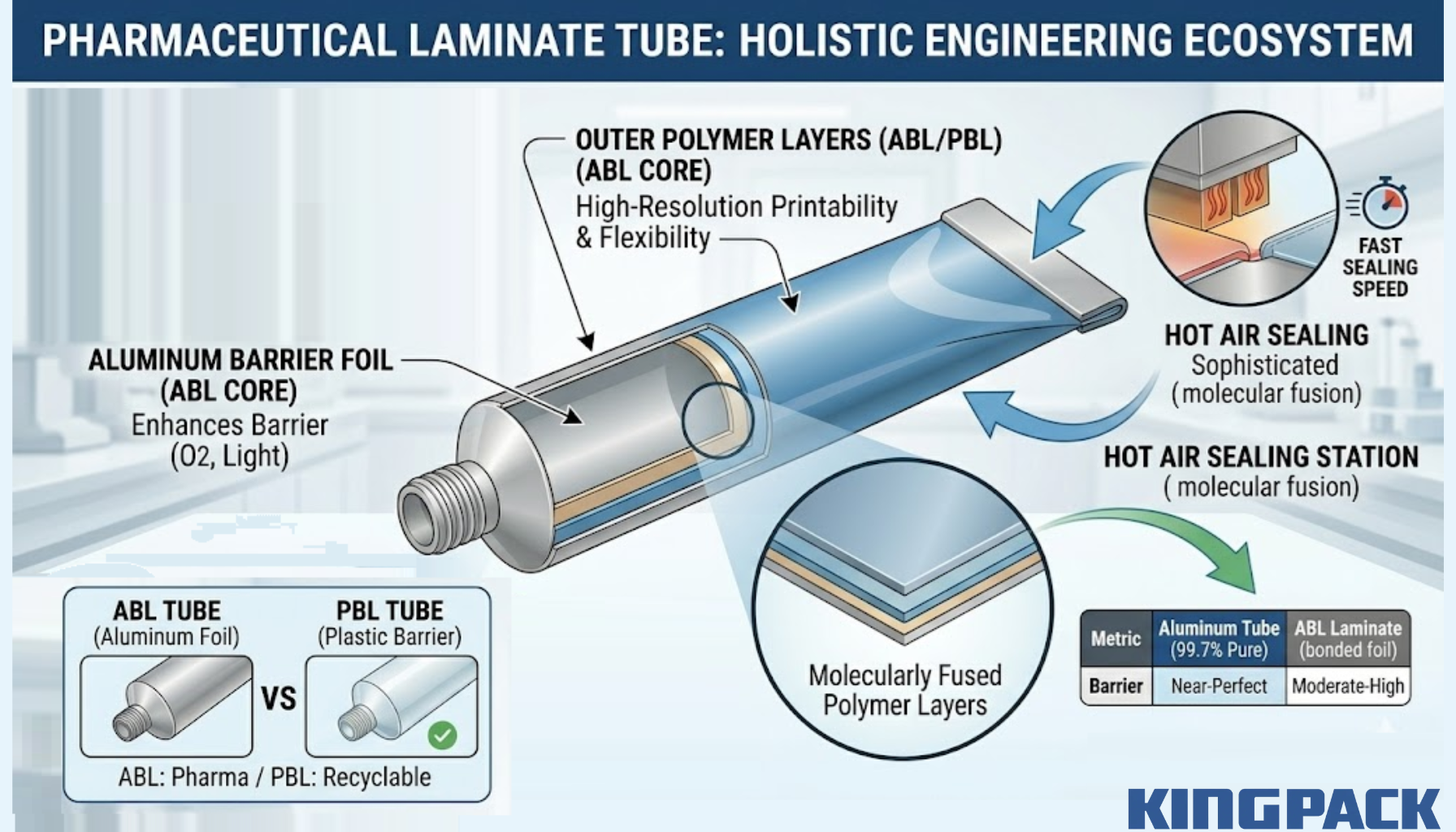 ABL and PBL tubes are lighter than aluminum tubes and accept high-resolution printing directly on the tube surface. They can be made fully translucent in PBL form. The heat-sealing process for laminate tubes is simpler to control than mechanical crimping, and the seals can be formed at high speed with good consistency.