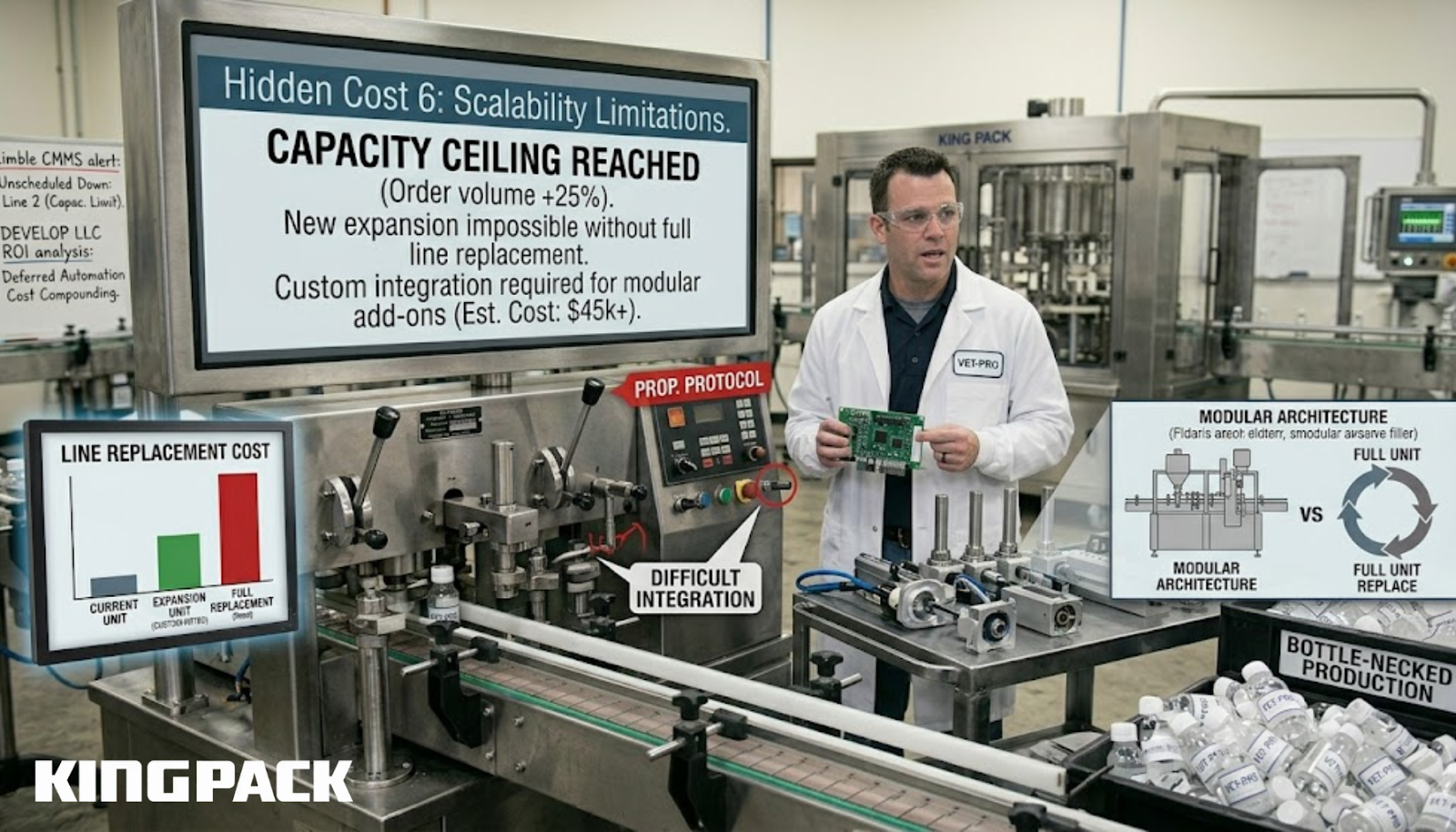 The ultimate scalability failure of a low-cost filling machine is that it often cannot be upgraded at all. When production requirements outgrow the machine’s capability, the entire unit must be replaced rather than expanded. That replacement resets the purchase cost clock and repeats every associated hidden cost, installation, commissioning, validation, operator training, and compliance documentation, from the beginning.