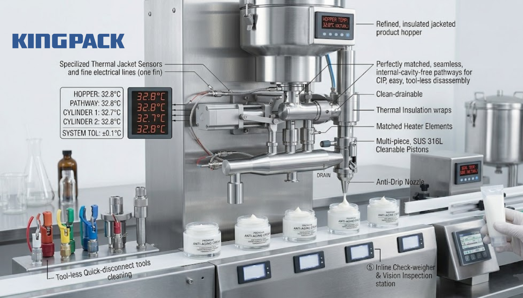 If the filling zone becomes cooler than the storage hopper, paste viscosity increases and flow consistency drops. If it becomes too warm, sensitive cosmetic actives may degrade on contact.