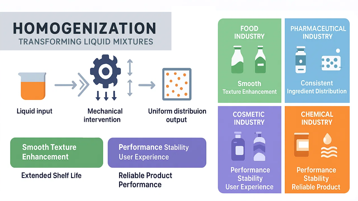 - Food homogenization improves milk, sauces, dressings, and beverages by creating smooth and stable products.