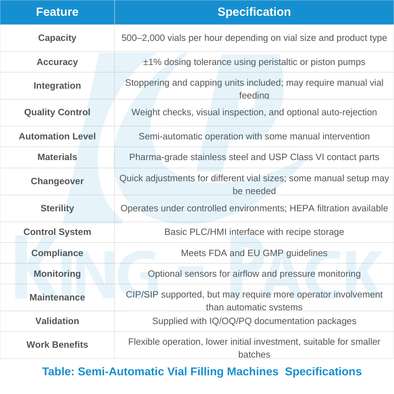 | Semi-Automatic Vial Filler | 500 – 2,000 | Small batches, R&D, clinical trials | Flexibility, lower investment, easy changeover |